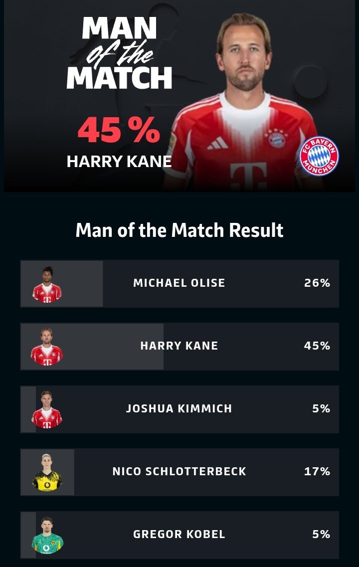 10月19日讯 德甲第7轮焦点战,拜仁2-1多特蒙德。凯恩杆位出战,贡献1粒得分 ,赛后当选全场最佳。