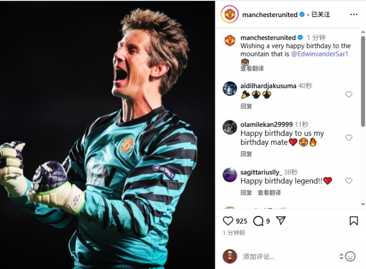 曼联官方Instagram写道:“祝门前的那座大山——范德萨生日快乐!”