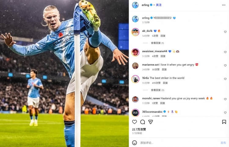 11月10日讯 曼城在本轮英超焦点战主场作战 3-0完获胜 物浦,哈兰德在失点后头槌破门。