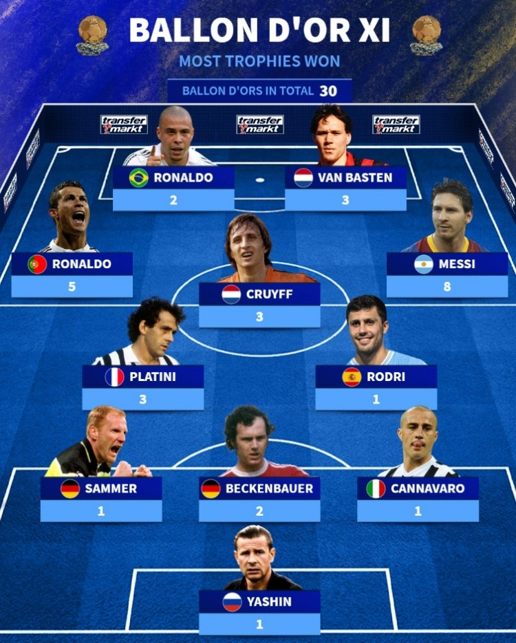 前场球员:C罗(5次)、罗纳尔多(2次)、范巴斯滕(3次)、梅西(8次)