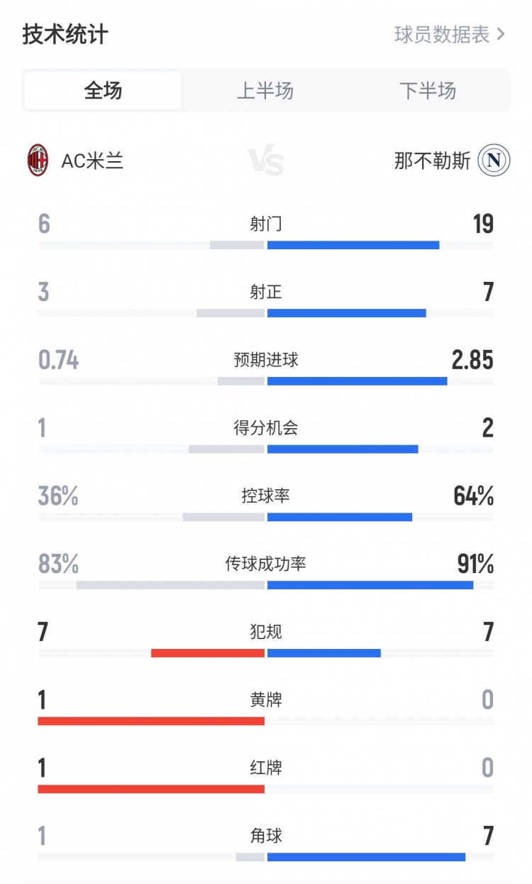米兰2-1那不勒斯全场数据:射球 6-19、预期得分 0