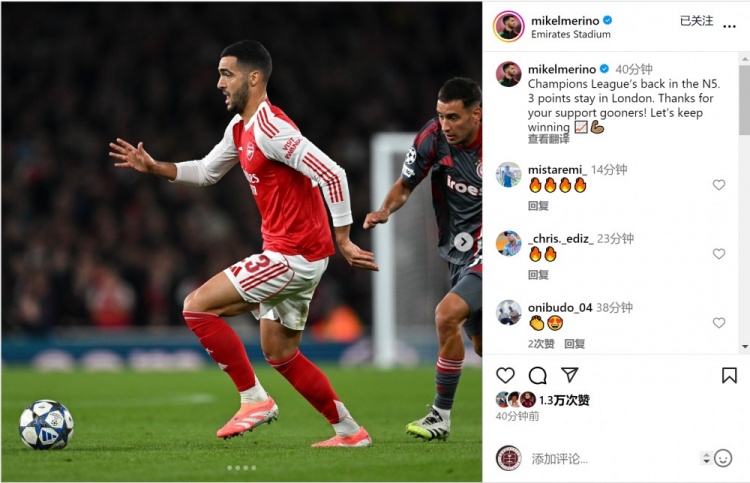 阿森纳中场球员梅里诺社媒晒出赛事 照片,英超直播并写道:“欧冠重回北五区,将3分留在伦敦。”