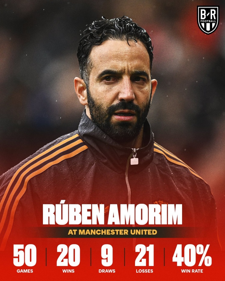 美媒B/R Football晒出海报,英超直播超清无插件海报中罗列出阿莫林执教曼联以来的战绩:50场赛事 ,20胜9平21负,胜率40%。