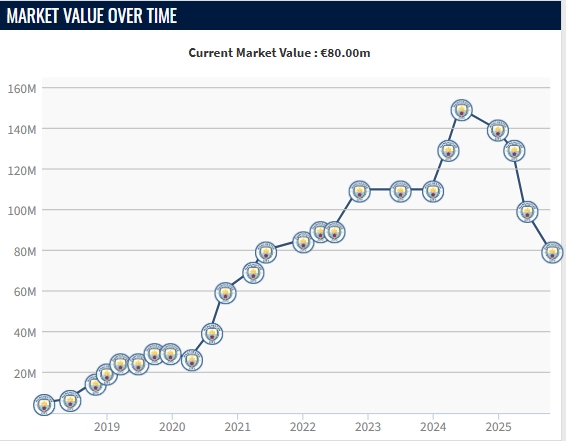 10月17日讯 今日德转更新英超球员身价,25岁福登身价跌出亿元,目前为8000万欧,直播英超免费直播在线观看对比1年前1.5亿欧的身价已经腰斩。
