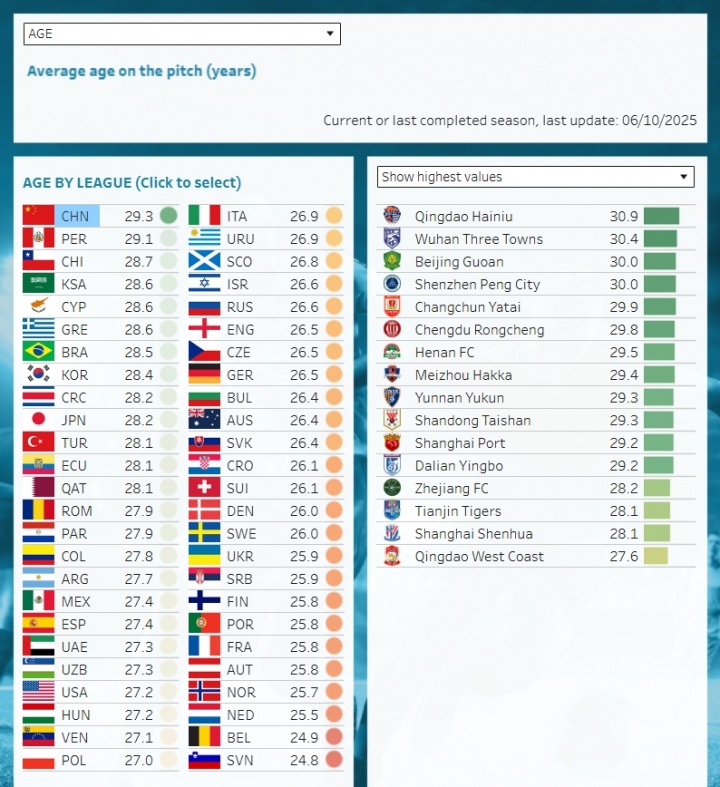10月18日讯古代足球 运动活动 权威统计机构CIES于10月6日发布最新统计,中超仍是全球平均年龄最大的主流职业联赛 。