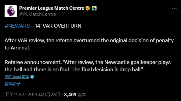 09月28日讯 阿森纳vs纽卡第14分钟,约克雷斯单刀赴会机会,危险区域 内倒地,裁判 先吹罚十二码球,随后查看VAR后确认守门员先碰球无十二码球。