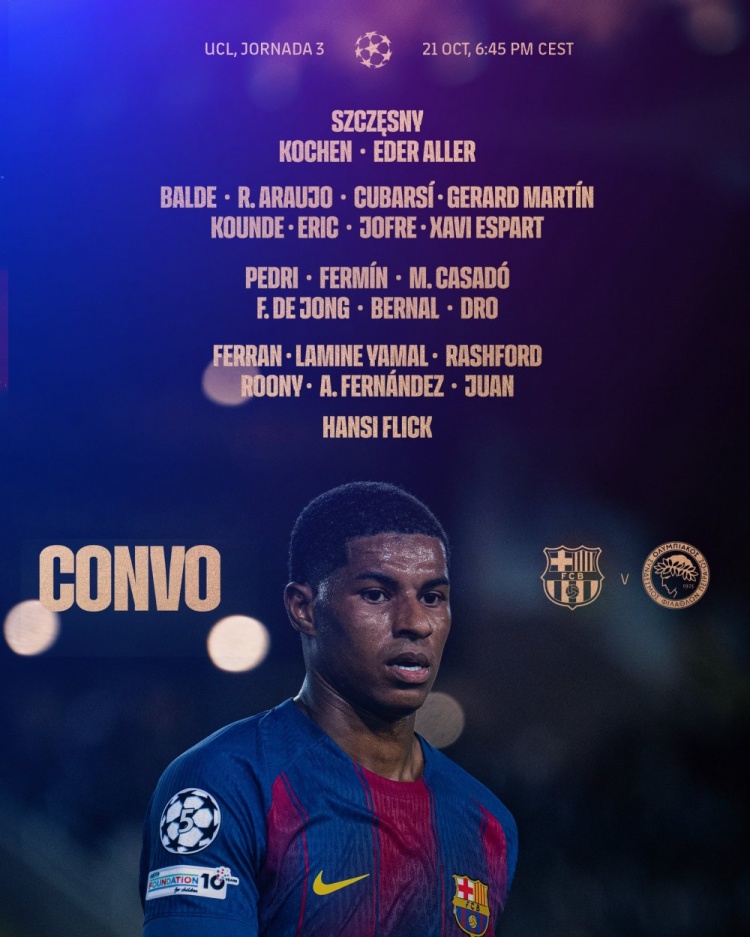 10月21日讯 北京时间明天凌晨,巴萨将在欧冠职业联赛 阶段第三轮赛事 中主场作战 对阵奥林匹亚科斯,英超直播超清无插件巴萨公布了此役的球员名单。费兰-托雷斯回归,克里斯滕森、莱万、拉菲尼亚、奥尔莫、霍安-加西亚、加维缺席。