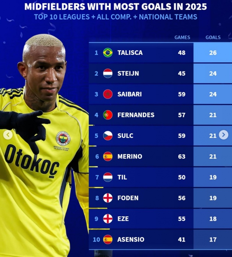 1月4日讯 《转会市场》统计了2025年前十职业联赛 中场球员的俱乐部+国家队各项赛事得分 最多情况,塔利斯卡居首。