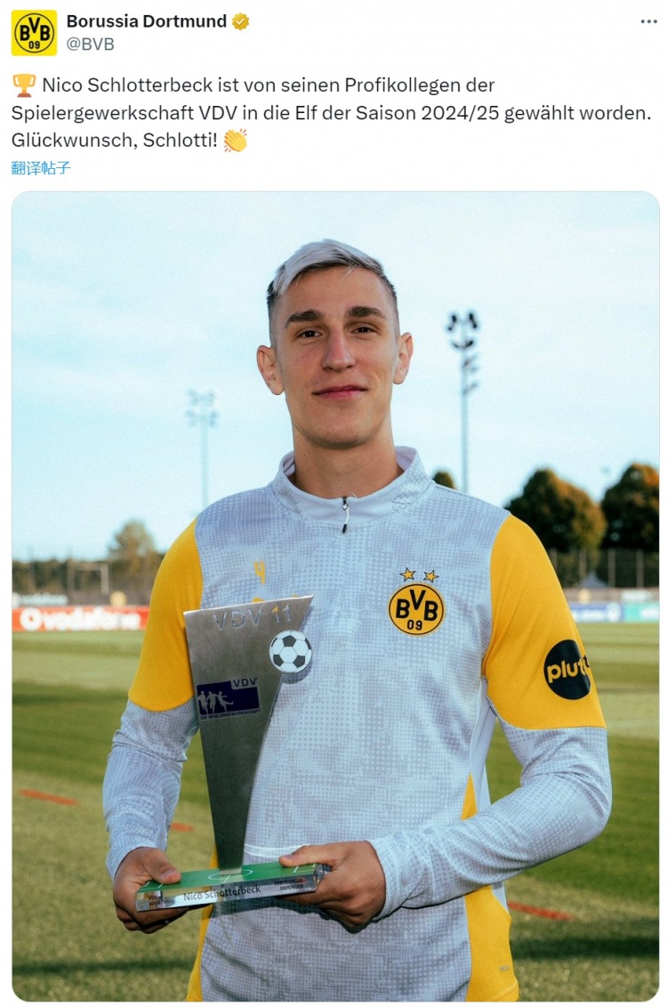 施洛特贝克入选德国职业球员工会(VDV)上赛季最佳阵形 ,英超直播超清无插件多特官方社媒晒出他手捧奖杯的照片,对他表示祝贺。