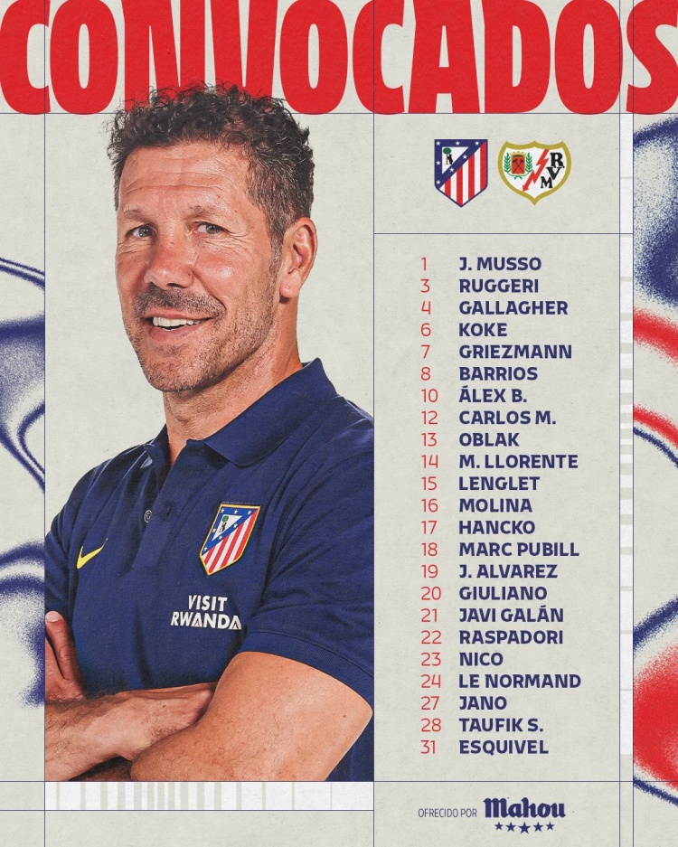 前场球员:7-格列兹曼、19-阿尔瓦雷斯、20-朱利亚诺-西蒙尼、22-拉斯帕多里、23-尼古拉斯-冈萨雷斯