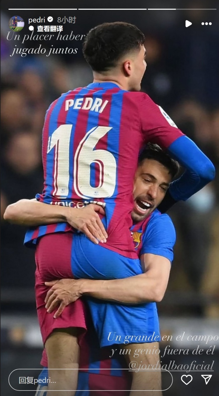 10月8日讯 阿尔巴宣布将在本赛季结束后退役,巴萨中场球员佩德里社媒发文致敬。